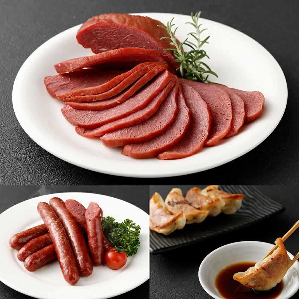 セットの内容は香辛料の香りと鹿肉の風味が特徴のソーセージ、塩味が効いていてお酒との相性が抜群のくん製、そして熊本でも有名な餃子店「弐の弐」とのコラボで作り上げた薄皮の餃子の3つになります。